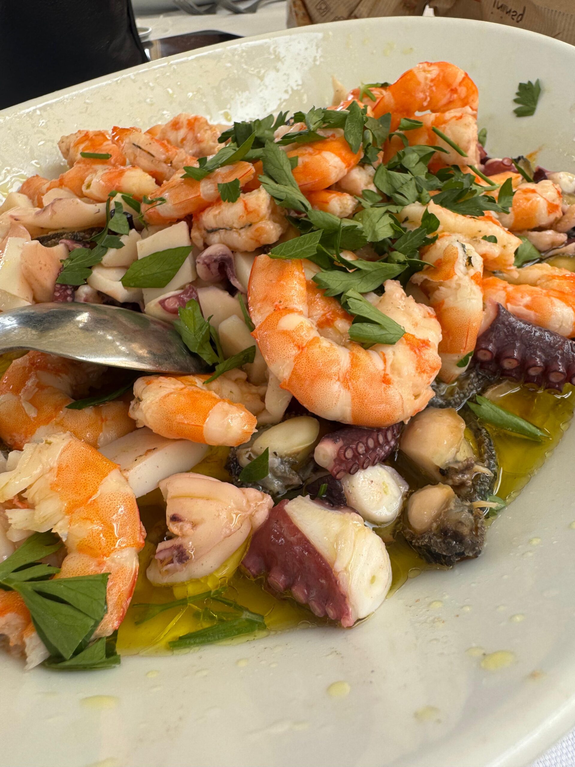 Ogni elemento – polpo, seppia, gambero e occhi di bue ( molluschi tipici della costa)– è cotto con delicatezza e servito tiepido, condito solo con olio extravergine, limone, prezzemolo e la sicurezza che meno è meglio.